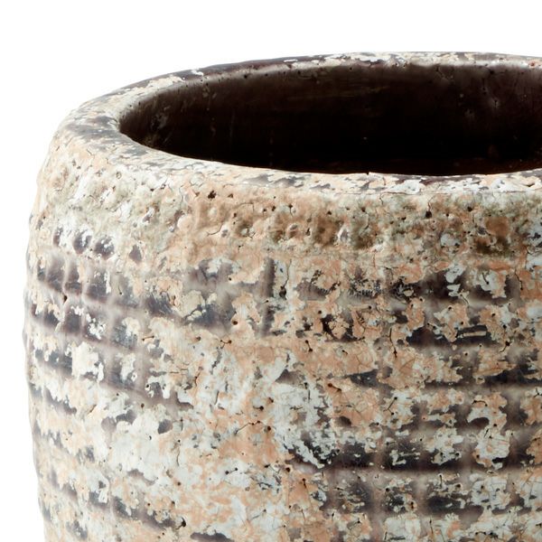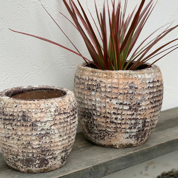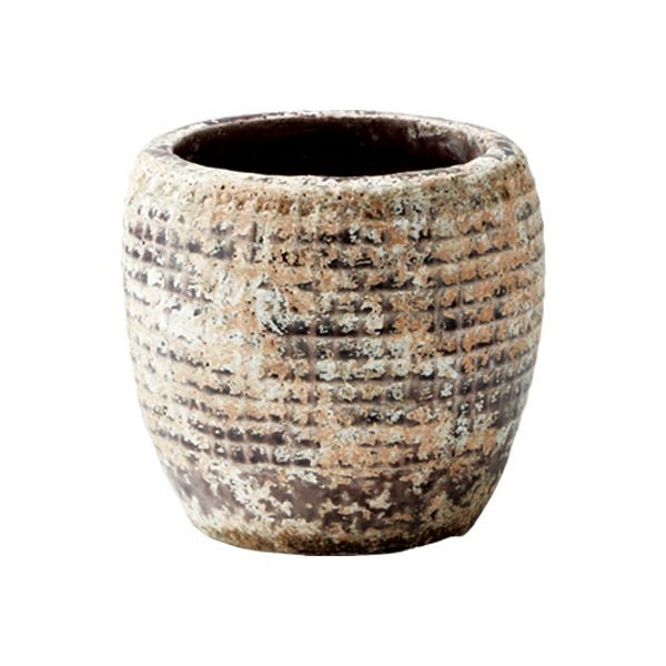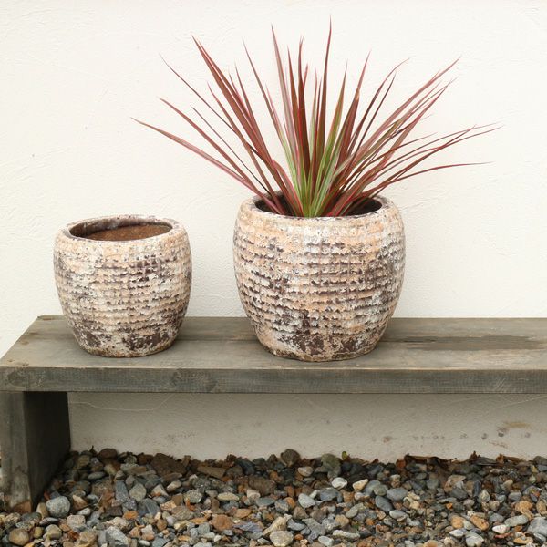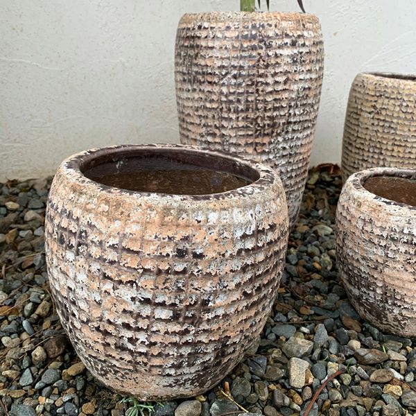 爬虫類の肌のような特徴的な質感が魅力的なポット。フラワーベースとしてや、グリーンを組み合わせるのもおすすめですが、程よい存在感があるので、置物としてそのままで飾るのも素敵です。豊富なサイズバリエーションをご用意しております。