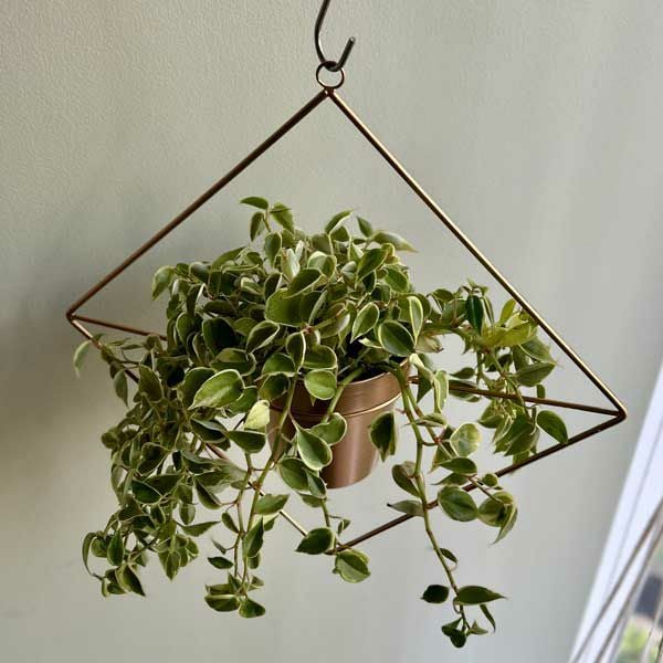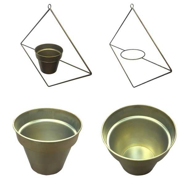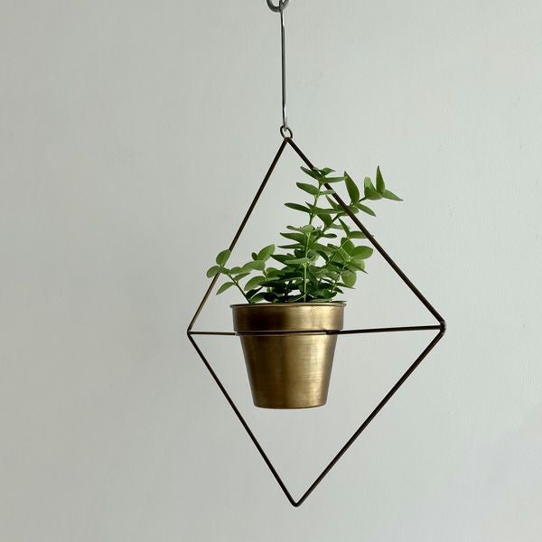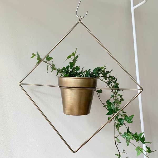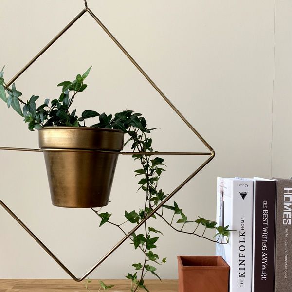 ハンギングタイプの鉢カバー。ハンキングのフレームで揺らぐ縁を楽しめます。空間を邪魔することなく、余白を彩ります。風通しや日当たりのいい場所に移動しやすく、植物にとっていい環境を作れるのも魅力。