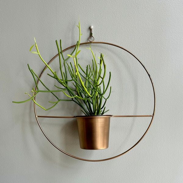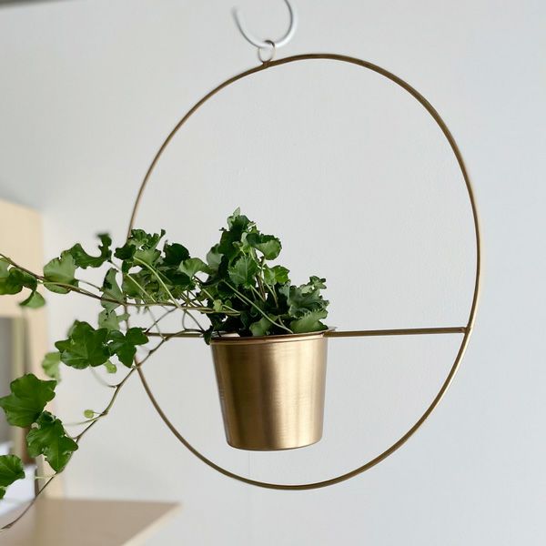 ハンギングタイプの鉢カバー。ハンキングのフレームで揺らぐ縁を楽しめ、空間を邪魔することなく余白を彩ります。風通しや日当たりのいい場所に移動しやすく、植物にとっていい環境を作れるのも魅力。