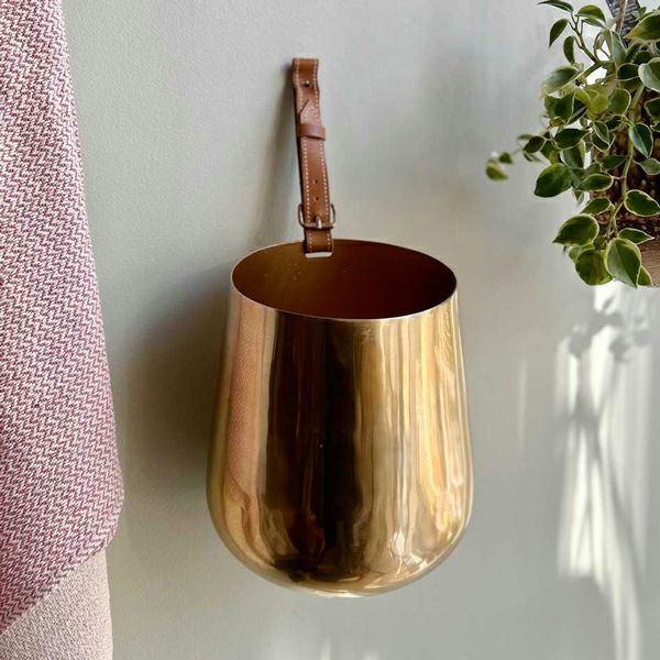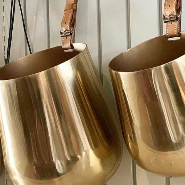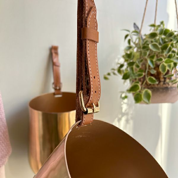 高級感がある鉢カバーと、牛革製のハンドルのセット。