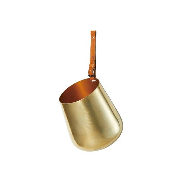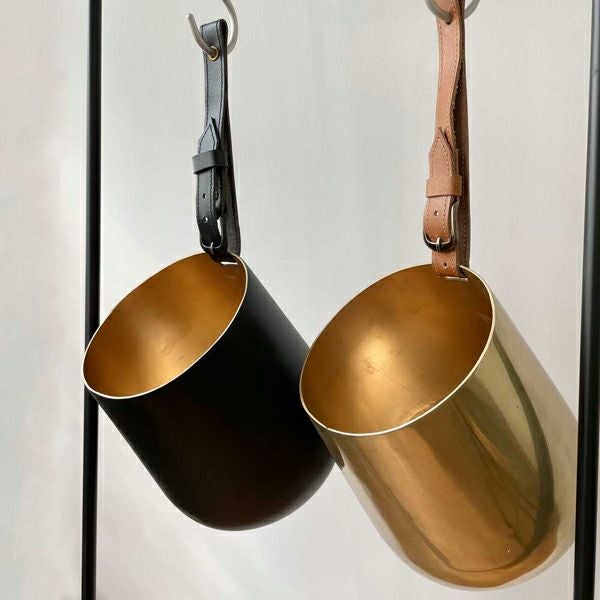 高級感がある鉢カバーと、牛革製のハンドルのセット。