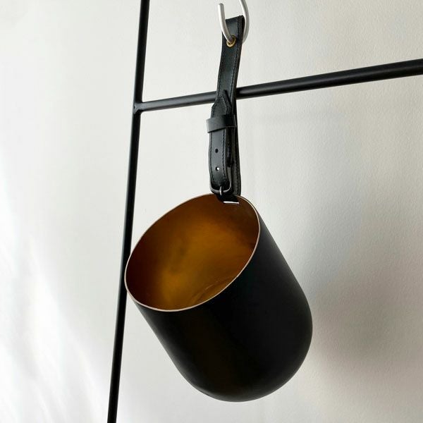 高級感がある鉢カバーと、牛革製のハンドルのセット。