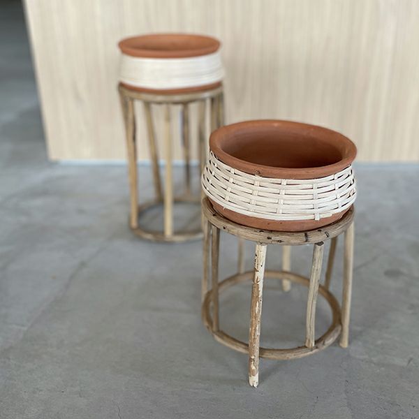 テラコッタ素材のポットと木製ポットスタンドのセット。