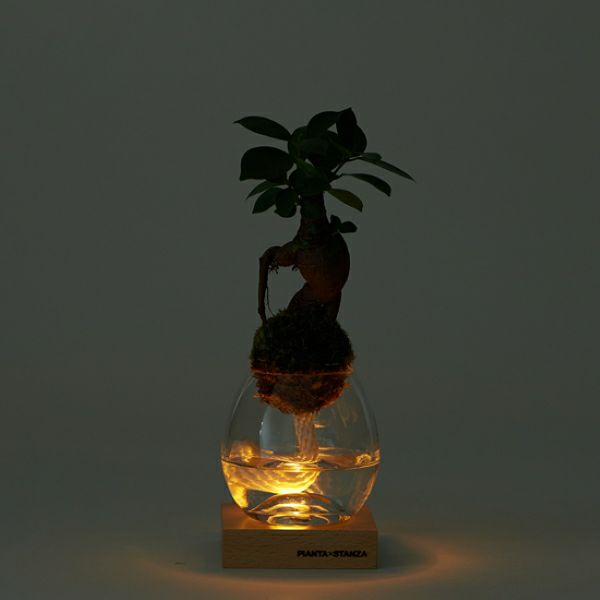アルコールランプのようなシルエットで、キャンドルの代わりにテーブルや棚の上に置いて楽しめるトーチ。付属の吸水ロープから植物が必要なお水を吸い上げてくれます。ガラス容器の中の水を清潔に保ってあげることで、植物は生育します。木製の台座に内蔵されたLED揺らぎライトが、キャンドルのようなあかりを灯します。ボタン電池式のため、コードを気にせず置きたい場所に置いて楽しむことができます。