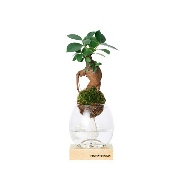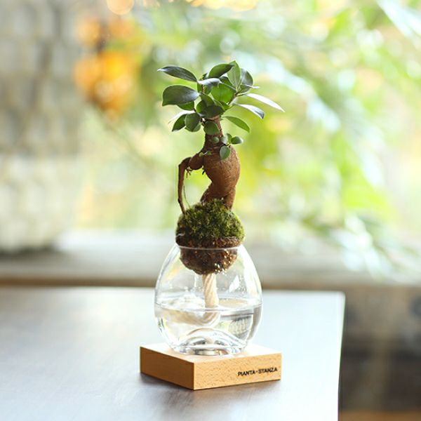 ヨガのポーズのような、株ごとに違う姿をもつガジュマル。葉には適度に霧吹きするのがおすすめです。