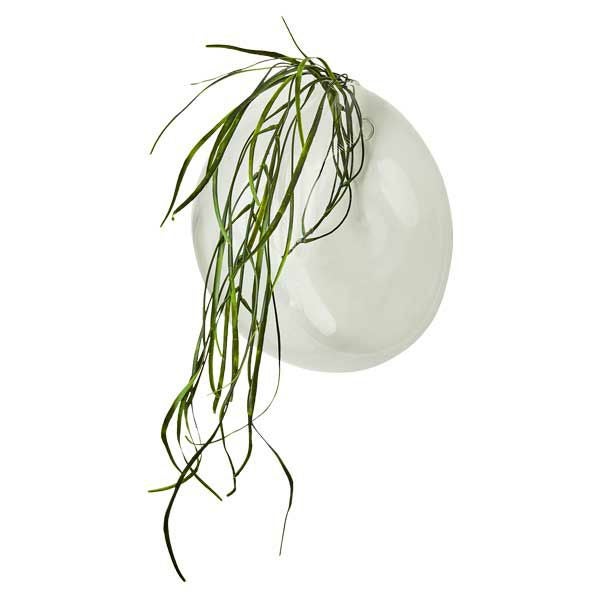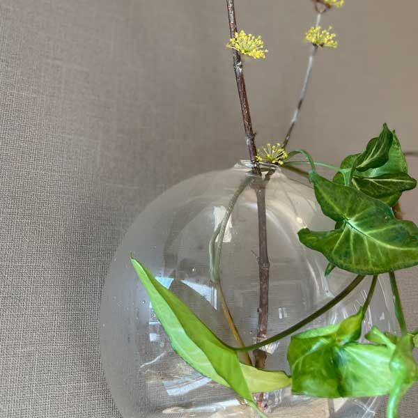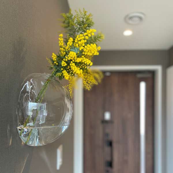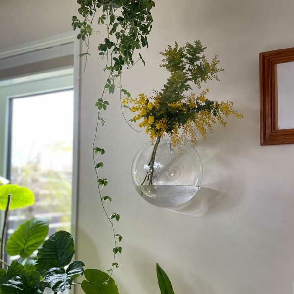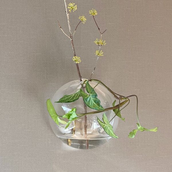 ガラスでできた壁掛け用のベース。透明感があり、一輪の花を挿しただけでも素敵な雰囲気に。シンプルにオブジェとしてお使いいただくのもおすすめです。