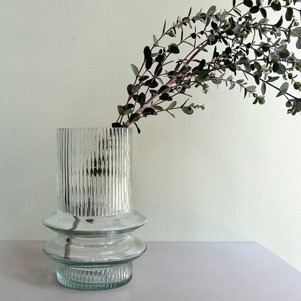 ユニークなフォルムのガラスベース。ストライプ柄が涼しげな印象です。一輪の花を挿しただけでも雰囲気良く飾ることができます。シンプルにオブジェとしてお使いいただくのもおすすめです。