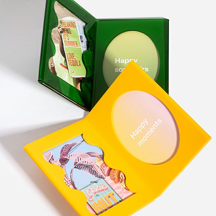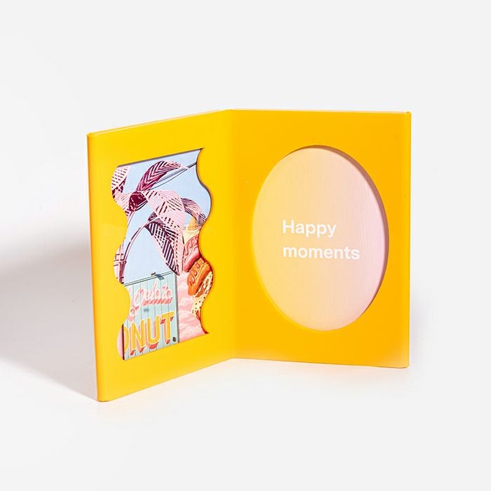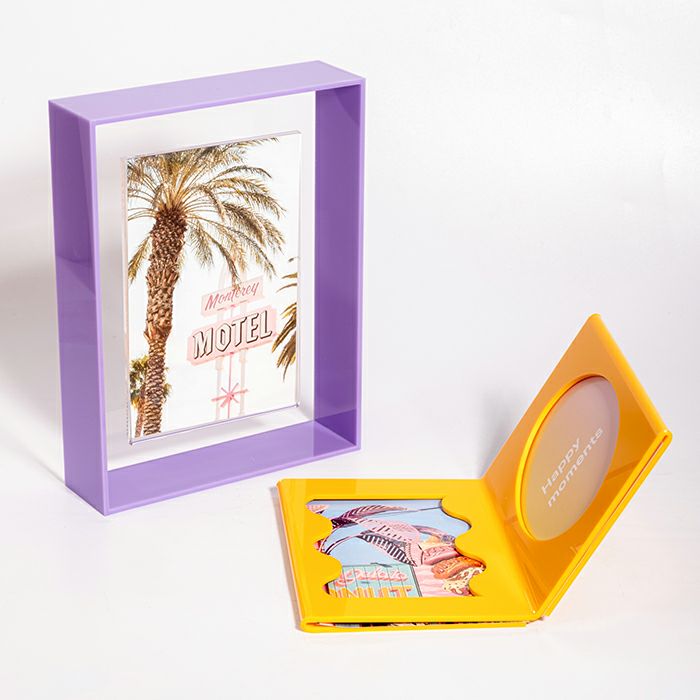 鮮やかな色合いとアクリルの質感がかわいくてポップな見開きのフォトフレーム。