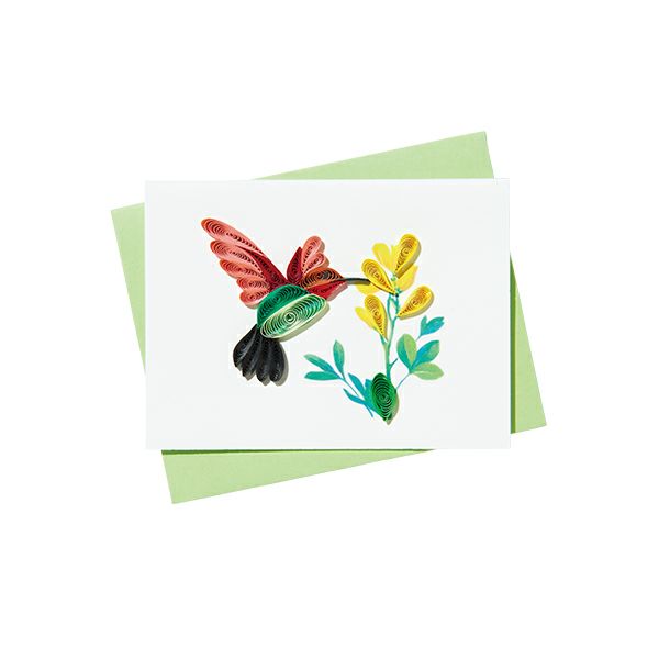 お花の蜜を吸うハチドリが描かれたグリーティングカード。デザインとコーディネートされた色の封筒が付属しており、二つ折りのカードの内側は白無地でメッセージが書き込めます。大切な想いを込めて、美しいカードを贈りましょう。