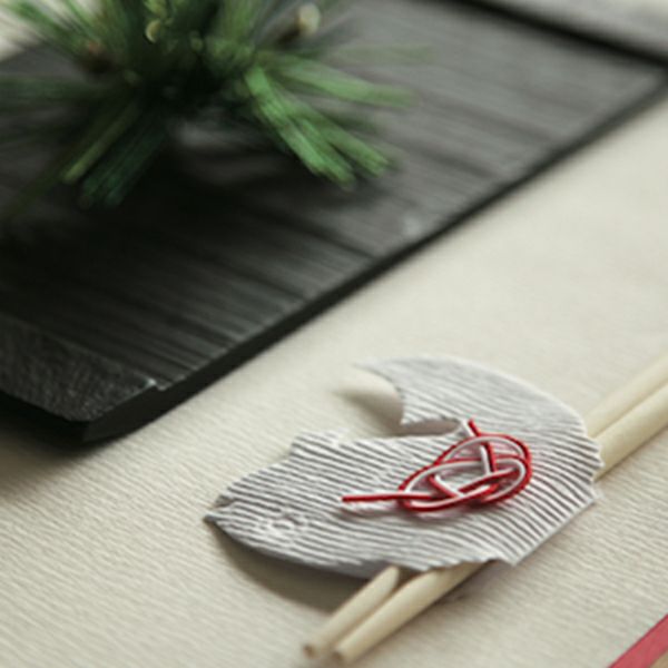 おめでたい日のテーブル演出にぴったりの鯛に紅白の水引を添えたモダンなデザイン。
