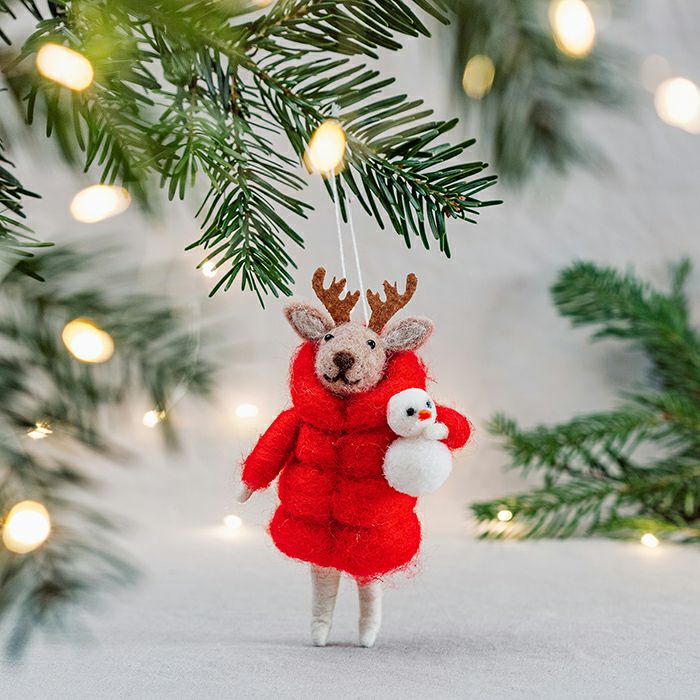 雪だるまを抱いた姿がかわいらしい、トナカイのオーナメント。