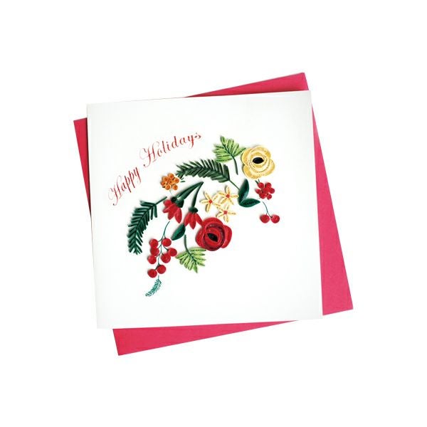 カラフルなお花や木の実などが描かれた賑やかな印象のグリーティングカード。「Happy Holidays」の文字入りでクリスマスカードにピッタリです。デザインとコーディネートされた色の封筒が付属しており、二つ折りのカードの内側は白無地でメッセージが書き込めます。大切な想いを込めて、美しいカードを贈りましょう。