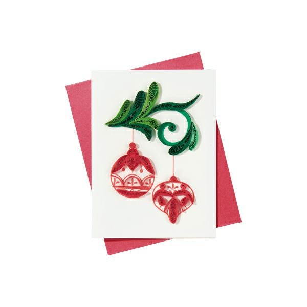 ゆらゆらと揺れる赤いオーナメントが描かれたグリーティングカード。クリスマスのメッセージを贈るのにピッタリです。デザインとコーディネートされた色の封筒が付属しており、二つ折りのカードの内側は白無地でメッセージが書き込めます。大切な想いを込めて、美しいカードを贈りましょう。