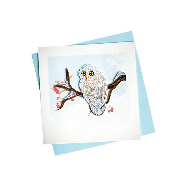 雪の中で枝に止まってこちらを見つめるフクロウが描かれたグリーティングカード。デザインとコーディネートされた色の封筒が付属しており、二つ折りのカードの内側は白無地でメッセージが書き込めます。大切な想いを込めて、美しいカードを贈りましょう。