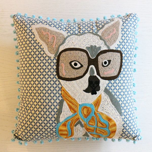 柄プリントのキャンバス地にサングラスをかけたチワワが刺繍されたクッション。
