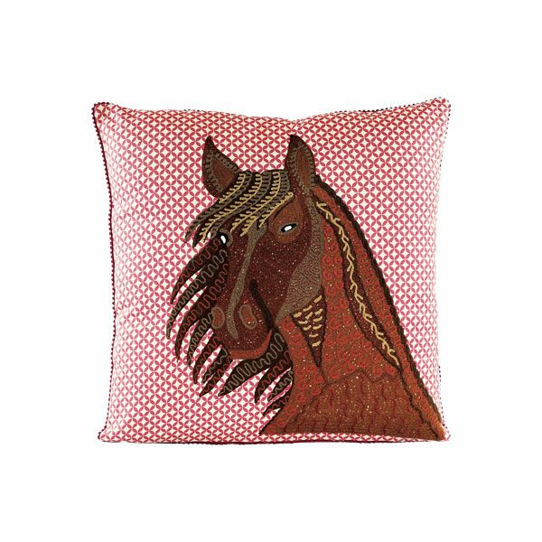 赤い柄プリントのキャンバス地に躍動感あふれる馬が刺繍されたクッション。