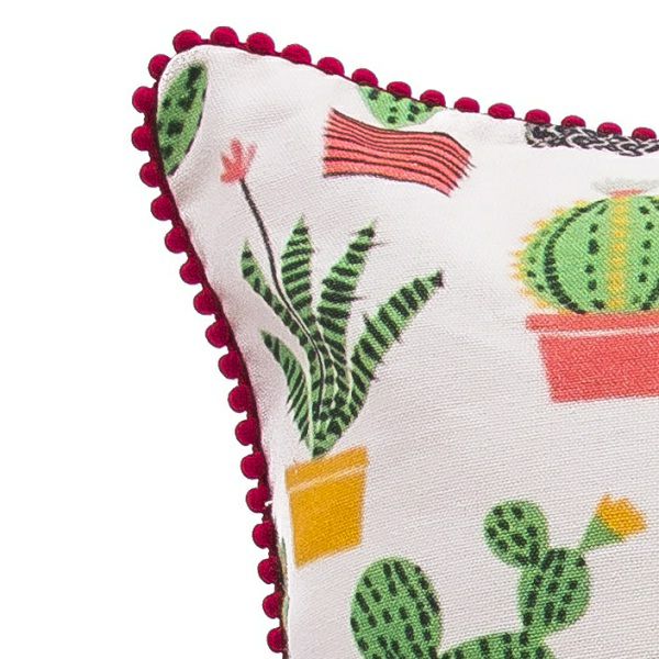 サボテン柄の布地にハンドメイドで丁寧に施された刺繍がポイント。