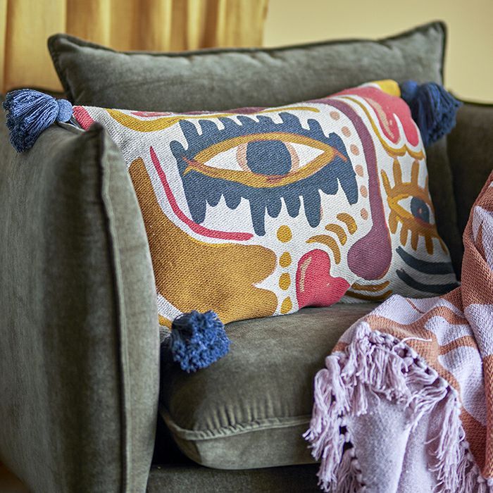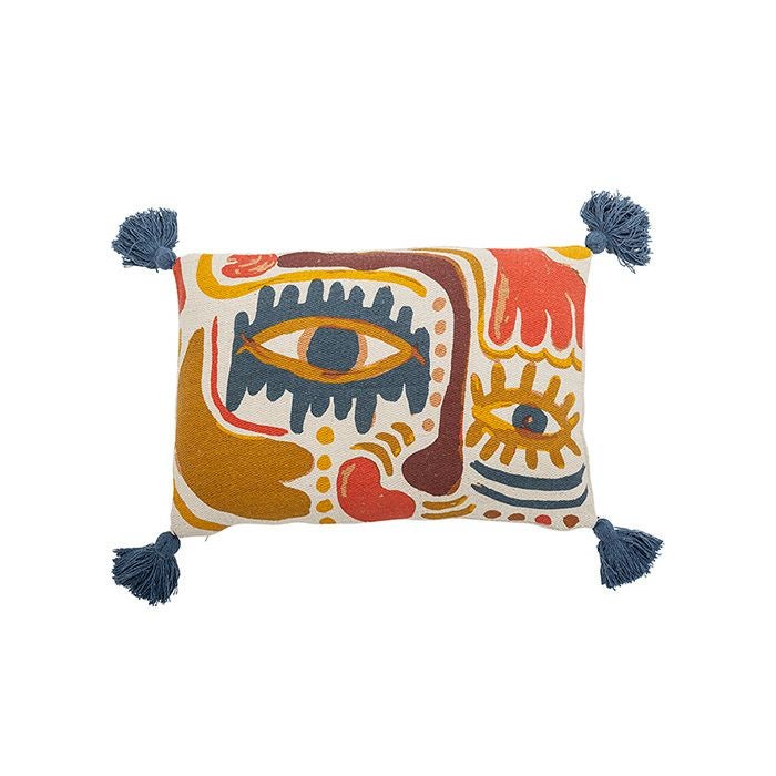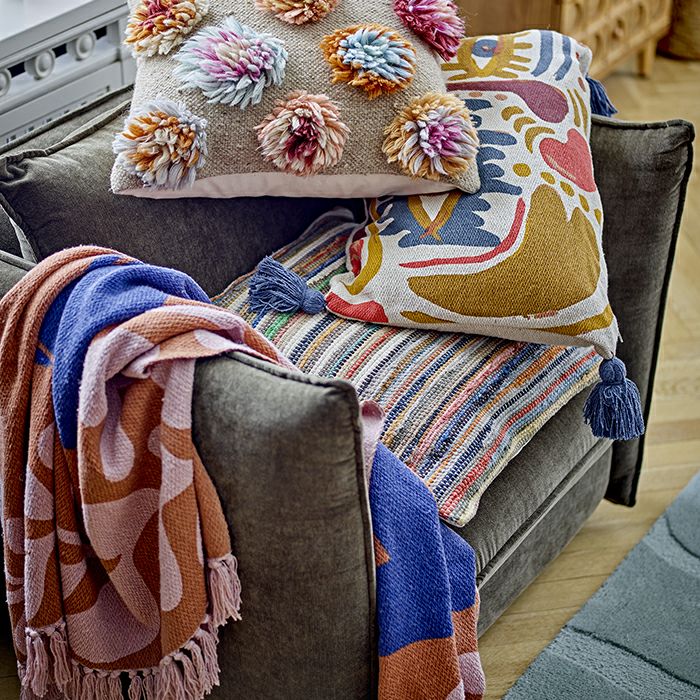 四隅にブルーのフリンジが施されたデザインで、どんな空間にもスタイリッシュにマッチします。