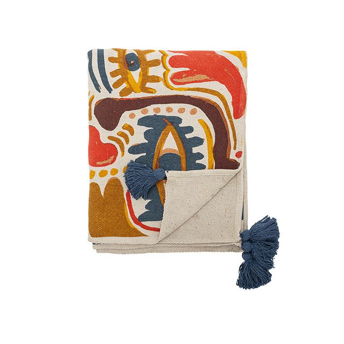 四隅にブルーのフリンジが施された細部までこだわったデザインで、ソファカバーとして使っても素敵です。