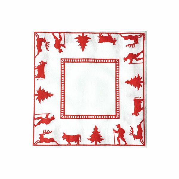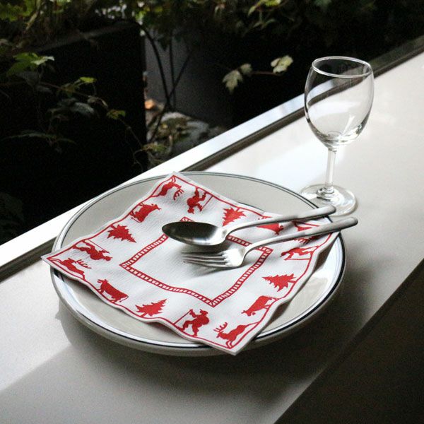 テーブルを華やかに彩るナプキンです。 プレートに載せるだけで簡単におしゃれなテーブルに変身、会話も弾む華やかなテーブルコーディネートが完成します。おもてなしや日々の暮らしでは、気軽に使える紙ナプキンが便利です。ゲストも気兼ねなく口を拭いたりできますし、ラッピングアイテムとしても活躍します。布と紙の2つの素材の良いところを持ち合わせた厚手の不織布なので、水分を吸い取りやすく濡れても破れにくくて丈夫です。適度な厚みと重さで、ナプキンリングに通しても形をキープできます。テーブルや膝の上からはらりと落ちてしまう心配も減りそうです。スキーをする人、もみの木、カウベルをつけた牛、トナカイと、アルプス地方の冬の景色が描かれたナプキンは、ホリデーシーズンにぴったり。クリスマスには、手や口を拭きながら食べるチキンに添えてみてはいかがですか。