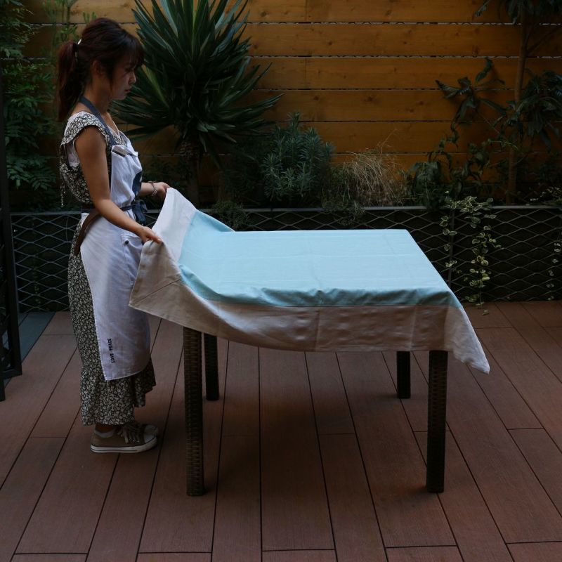 落ち着きのあるグレイッシュトーンが特徴的な2トーンのテーブルクロス。リネン100%のテーブルクロスは洗うたびにしなやかに柔らかく変化していき、独自の風合いを増していきます。お手入れ方法を守っていただくことで、永くご愛用いただけます。テーブル面には撥水加工が施されており、室内だけではなくお外でも。大きめサイズなので、ゆったりとテーブルに掛けてお使いください。カラーは全てupstairsのオリジナルカラー。実際にスタッフが海外へ買い付けに行き、サイズやカラーの組み合わせをコーディネートしました。テーブルコーディネート映えする落ち着いた色味は、他では手に入らないアイテムです。こちらの商品はPATIOPETITEサハラ・ダイニング4人掛け(ガラス天板付)にご使用いただけるサイズです。