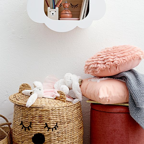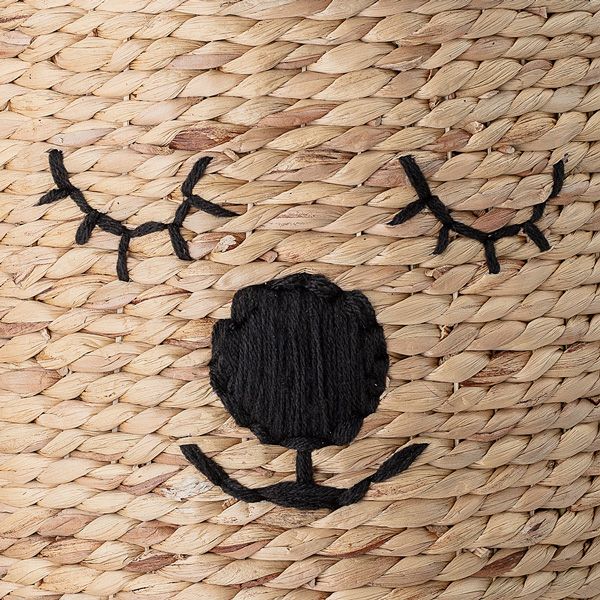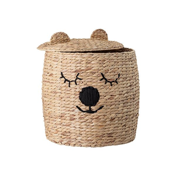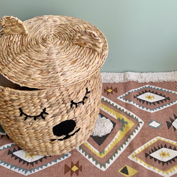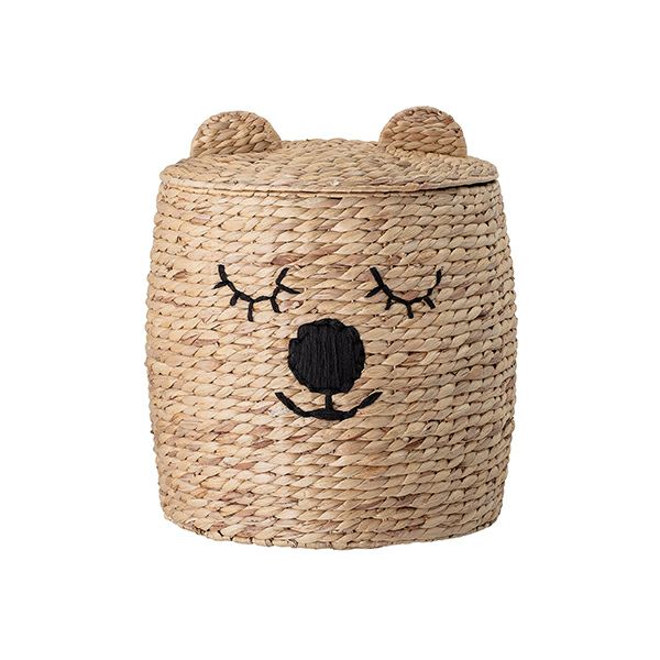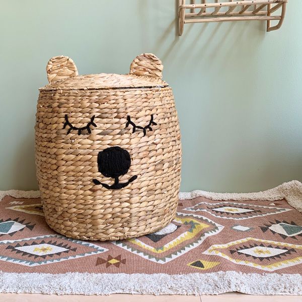 眠っているクマの表情がとってもかわいい蓋つきのバスケットです。ウォーターヒヤシンスという柔軟性と耐久性が高い素材で作られており、ラタンとは一味違った少し大きめの編み目から、温かみや重厚感、高級感が感じられます。おもちゃや服を収納したり、お片付けが楽しくなるデザイン。お子様のお部屋に置くだけで絵になりますね。ギフトにもぴったりです。