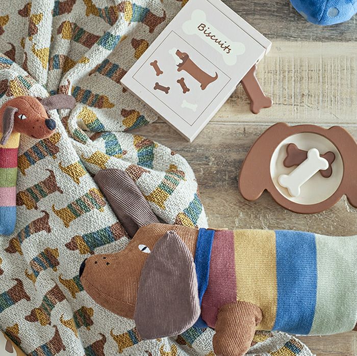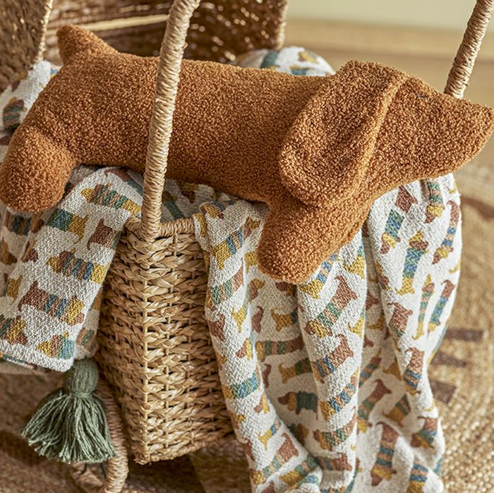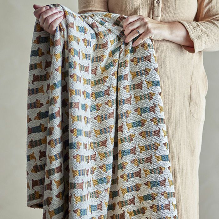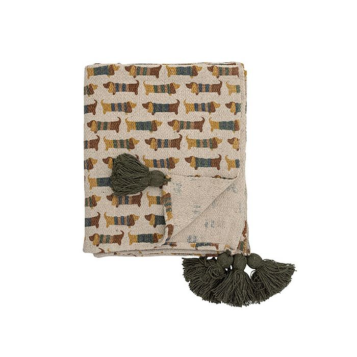 ナチュラルな色合い、犬の柄がかわいいコットンスローです。
