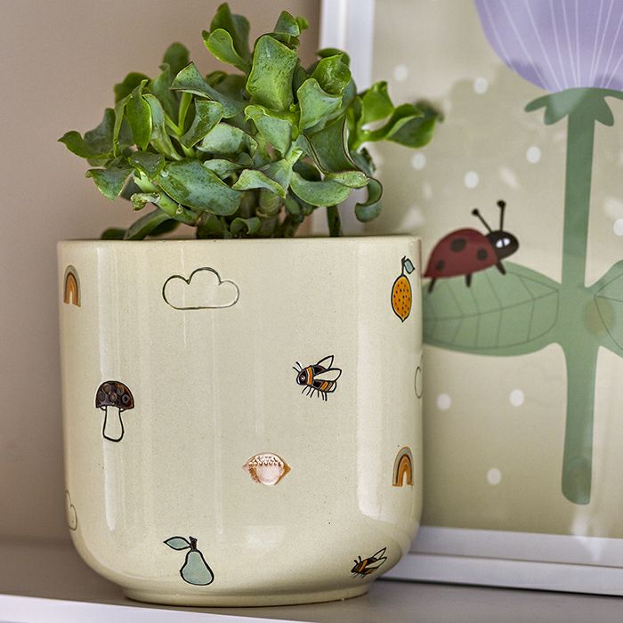 海外らしい手描きのモチーフがかわいらしい陶器のポットです。