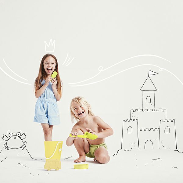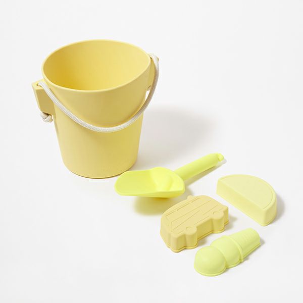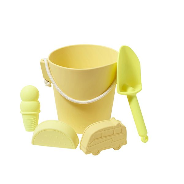 柔らかいシリコンゴムでできたバケツ、シャベル、型抜き(3種類)のセットです。