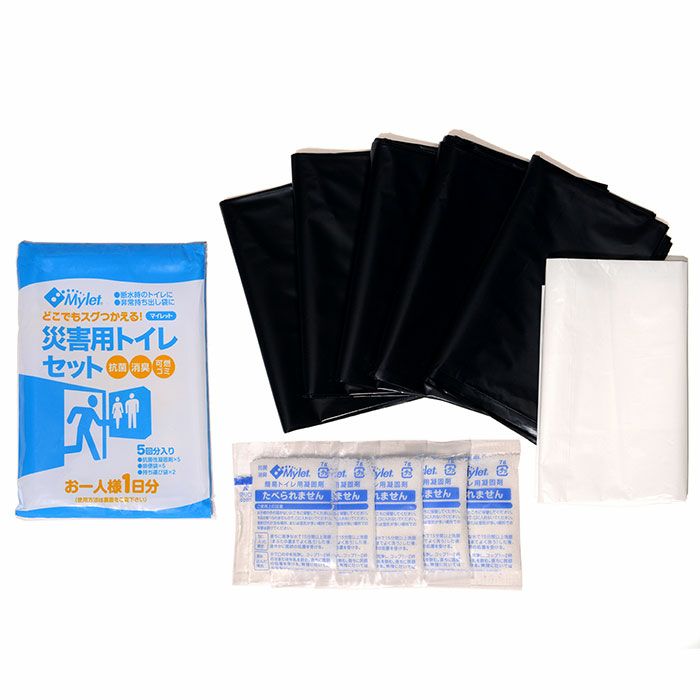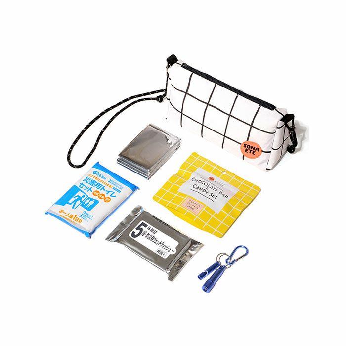 セット内容 | アルミ防寒シート、災害用トイレセット、LEDライト付きホイッスル、ウェットティッシュ、SONAETEオリジナルお菓子セット(チョコバー×3本&ハッカ飴×3個)