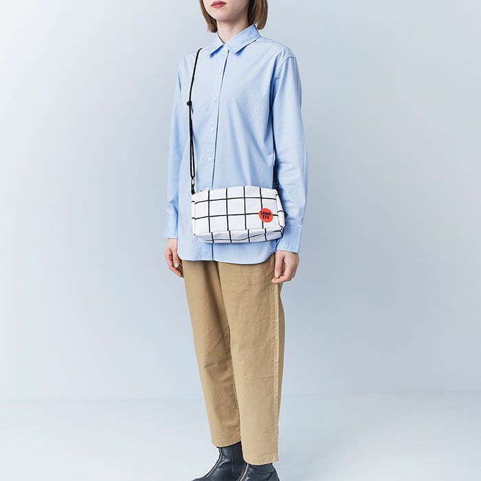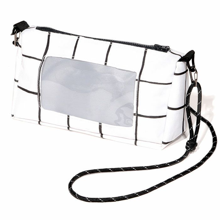 かさばらないコンパクトサイズのバッグのなかに、急場を切り抜けるためのミニマムな防災グッズが入っています。透明な小窓付きでスマホを出さずに操作が可能。付属の紐を用いてショルダーバッグにすることもできます。(紐の長さ:最大146cm)