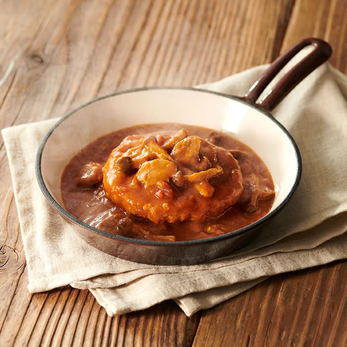 ふっくらとしたハンバーグをきのこたっぷりのソースで煮込みました。