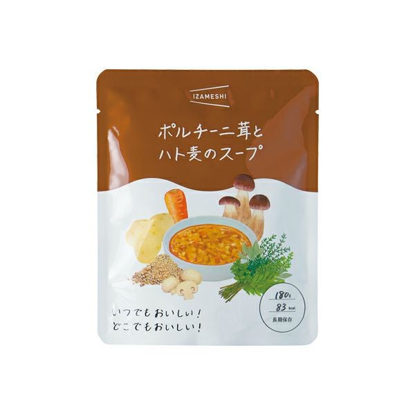 | 原材料 | 野菜(じゃがいも(国産)、たまねぎ、にんじん)、ハト麦、チキンエキス調味料、ポルチーニスライス、マッシュルームスライス、バター、ポルチーニパウダー、食塩、にんにく、香辛料、(一部に乳成分・ 鶏肉を含む)