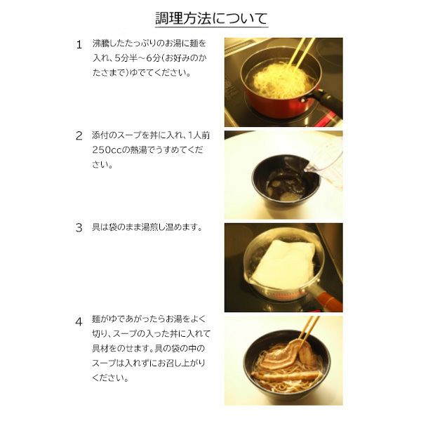 (4)麺がゆであがったらお湯をよく切り、スープの入った器に具材をのせます。具材の袋の中のスープは入れずにお召し上がりください。