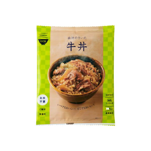 どんぶりもののもと:野菜(たまねぎ、長ねぎ)、牛肉(オーストラリア産)、しょうゆ、砂糖、醸造調味料、しょうが、清酒、昆布エキス、かつお節エキス調味料、ポークエキス調味料、チキンエキス調味料、にんにく、食塩/増粘剤(加工でんぷん)、(一部に小麦・牛肉・大豆・鶏肉・豚肉を含む) アルファ化米(白飯):うるち米(国産) |
