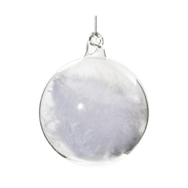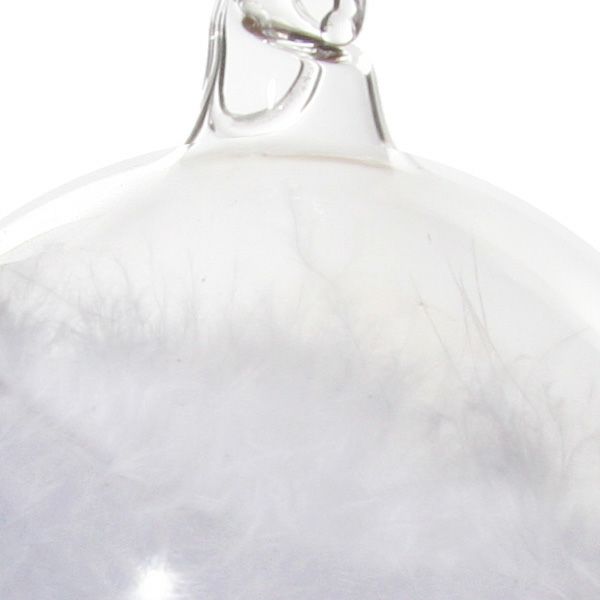 ふわふわの羽をガラスボールの中に閉じ込めたガラスオーナメント。