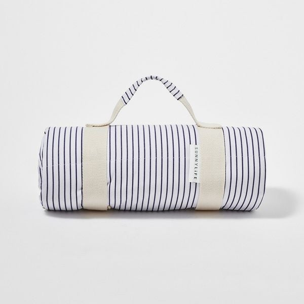 コットン100%のブランケット。裏面には防水加工が施されており、レジャーシートとしてもご使用いただけます。取り外し可能なハンドル付きで持ち運びも簡単です。