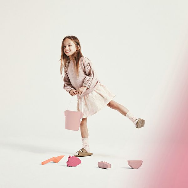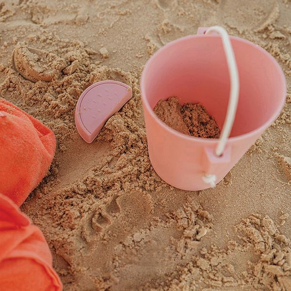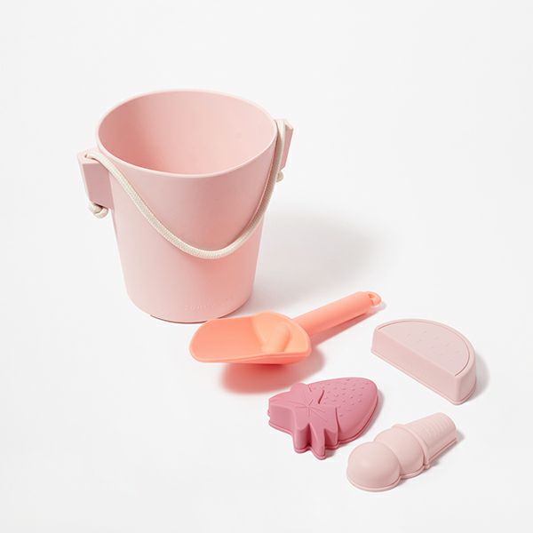 柔らかいシリコンゴムでできたバケツ、シャベル、型抜き(3種類)のセットです。