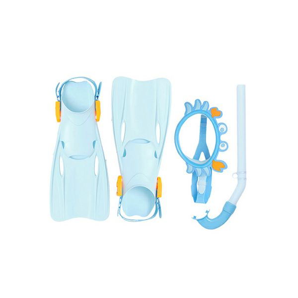シュノーケルゴーグル、フィン、持ち運びバッグがセットになっています。