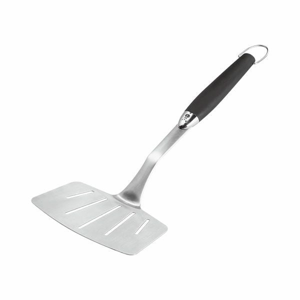 持ち手の感触が柔らかく、楽にしっかりと握ることができます。ネック部分はウェーバー ケトルの端までよりも長く、角度がついているので、手や腕が熱に晒されません。フライ返しのヘッドは幅広に作られているので、魚や大きな食材も楽に裏返すことができます。