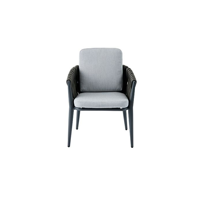 フレーム、クッション、ロープ、テーブル天板をグレーで統一することで、落ち着きのある洗練された印象が特徴のアウトドアファニチャーです。