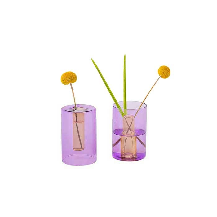円柱型の形状にガラスの質感が美しい小さなフラワーベースです。