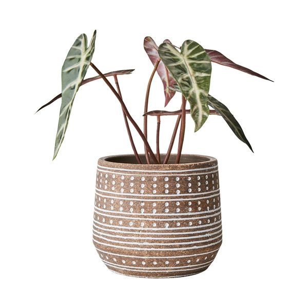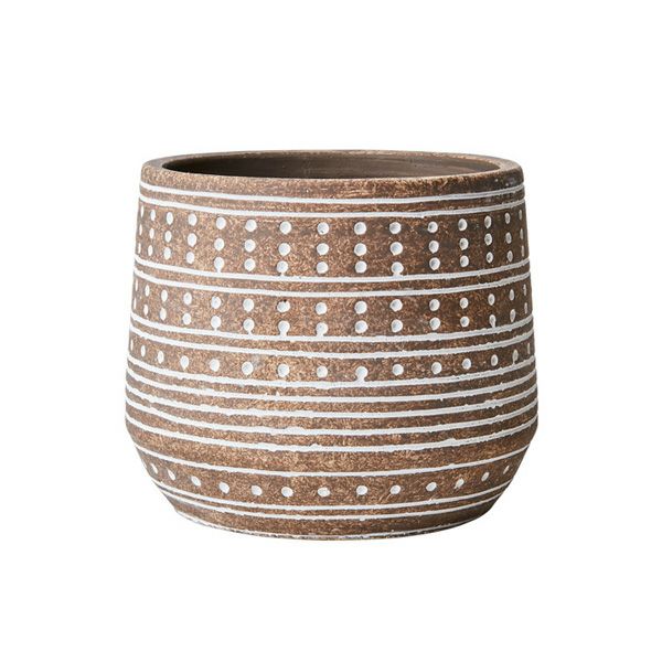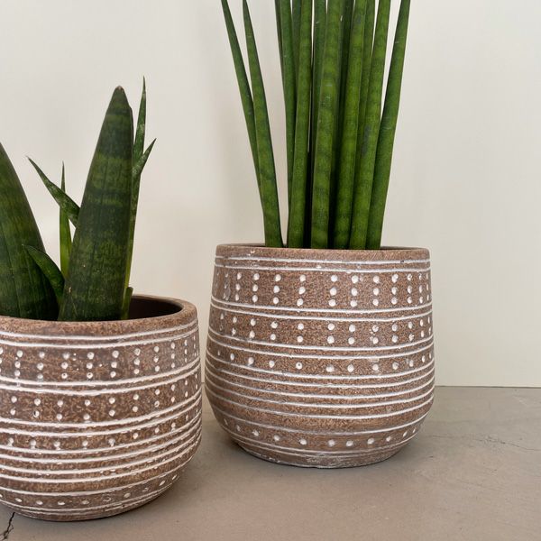コンクリート製の鉢カバー。アースカラーでグリーンとの相性もよく、どんなインテリアにも馴染みやすいです。サイズ違いで並べても◎