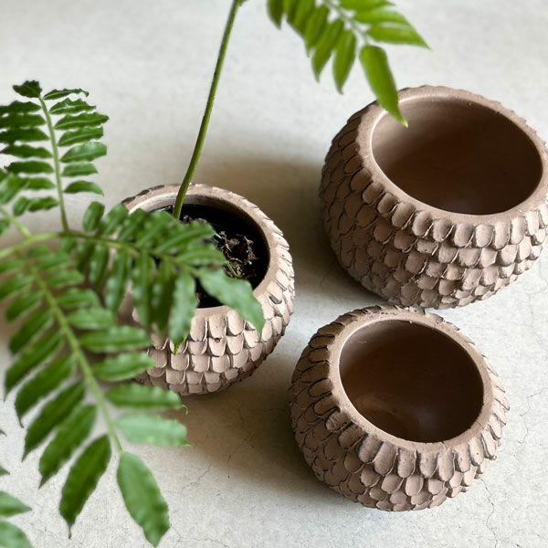松ぼっくりのようなフォルムの鉢カバー。