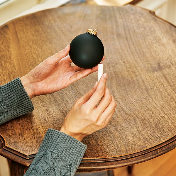 黒板仕様のボールオーナメント。チョークで好きな絵を描いて、オリジナルのオーナメントが作れます。チョークは拭き取れば落ちるので、描き直しも簡単。パターンを使って模様をつけたり、オリジナルデザインで世界に1つだけのオーナメントに。大切な人へメッセージを添えてツリーに飾っても素敵です。