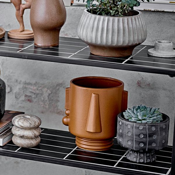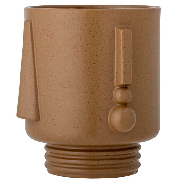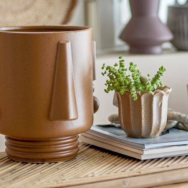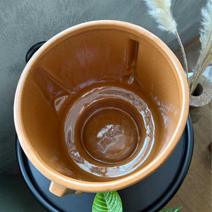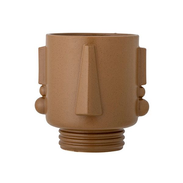 茶色のセッ器でできたフェイスデザインの鉢カバー。