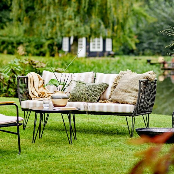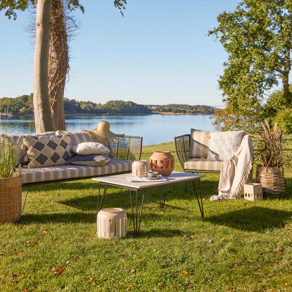 金属に手織りのポリエステルロープを使用したアウトドアチェア。