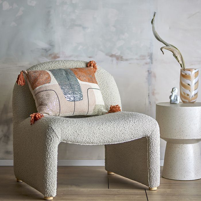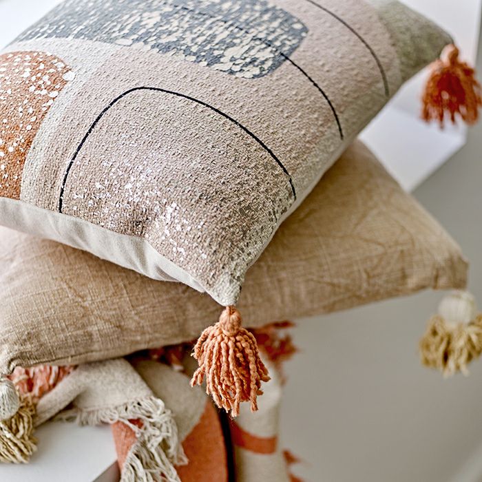 温かみのあるアースカラーと四隅にあしらわれた美しいタッセルが、どんなインテリアにも存在感を放ちます。
