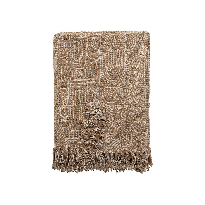 落ち着いたブラウンをベースに、幾何学模様を織り込んだコットンブランケット。