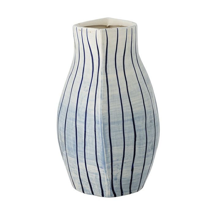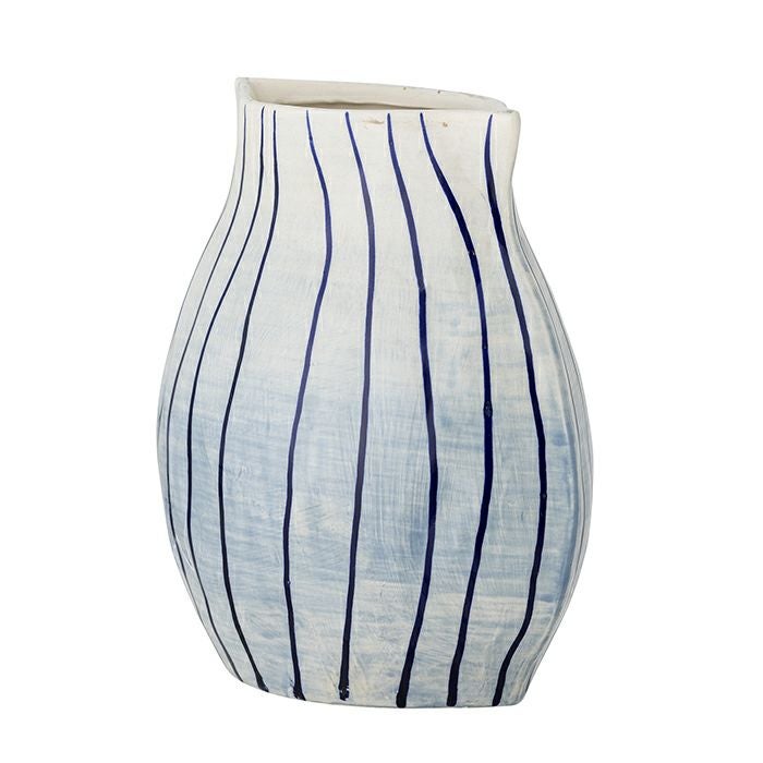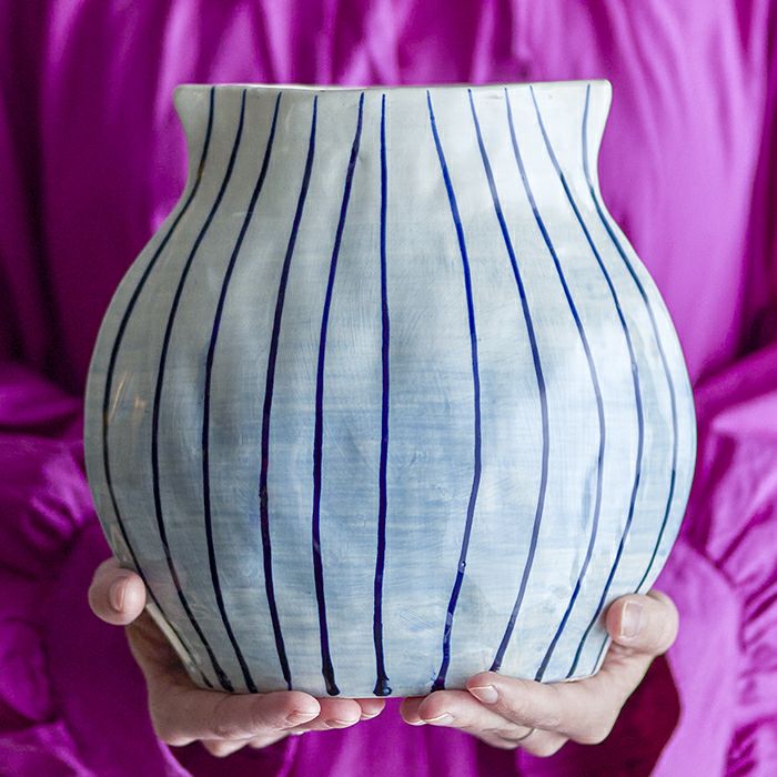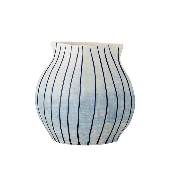 白と水色のやさしいグラデーションの上に、ネイビーの細いストライプを手描きで重ねたフラワーベース。